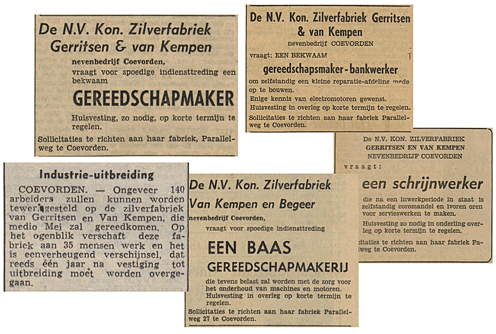 Coevorden ligt in het zuidoosten van Drenthe. Het Limburgs Dagblad van 5 juni 1947 zegt over deze streek: ‘De maar al te lang vergeten en verwaarloosde Zuid-Oosthoek van Drenthe, die in Holland geen andere reputatie had dan een verwaarloosde streek te zijn.’ Het gemeentebestuur en de middenstand deden veel moeite levenskrachtige bedrijven aan te trekken. De Coöperatieve Zuivelfabriek, de Coöperatieve Aardappelmeelfabriek ‘De Centrale’ en de Strokartonfabriek ‘Hollandia’ boden niet voldoende werkgelegenheid. De komst van zilverfabriek Gerritsen & Van Kempen zou meehelpen de werkloosheid te bestrijden. ‘Reeds wenkt een nieuwe toekomst voor de streek, waarvan Coevorden het handels-, industrie- en landbouw- en cultureel centrum is’, aldus het Limburgs Dagblad.