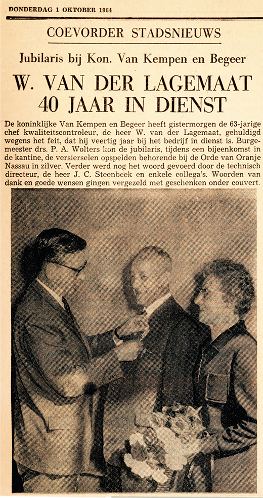 Burgemeester Wolters zei in 1964 in zijn toespraak tot dhr. Lagemaat die een koninklijke onderscheiding ontving: ‘Wil een bedrijf goed draaien dan moeten er ook goede vaklieden zijn en een van deze figuren is de heer Van de Lagemaat. Hij leidde jonge krachten op tot vaklieden en gaf mede de goede naam aan het bedrijf’.