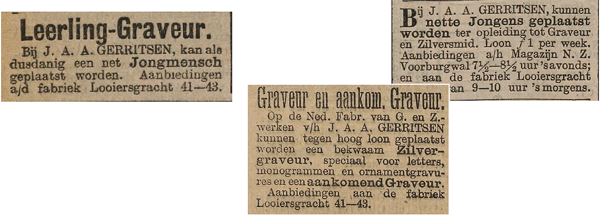Er zijn alleen uit de periode 1903-1906 krantenadvertenties voor graveurs en leerling-graveurs gevonden. Daarna duurt het vijftig jaar voordat er weer geadverteerd wordt voor leerling-graveurs.