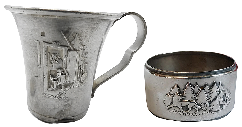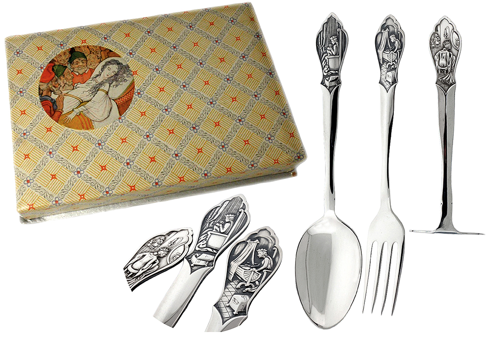 Het kindercouvert in deze sprookjesserie bestaat uit een lepel en een vork. Een mes hoorde er niet bij. Een complete set bestaat dus uit acht bestek- en serviesonderdelen. De beker heeft een oor. Een eierdop met eierlepel noemt men ook eiergarnituur. Een andere naam voor servetring is servetband. Alles verpakt in mooie etuidozen.