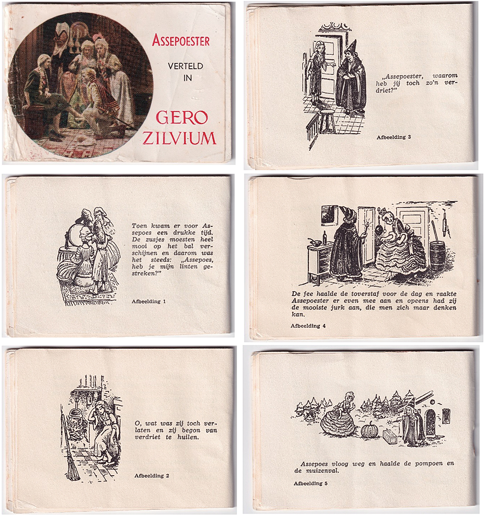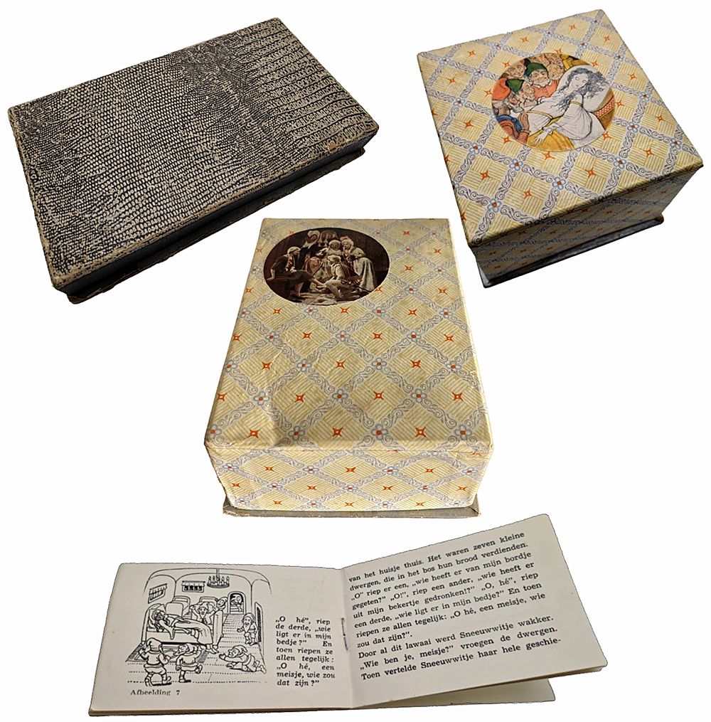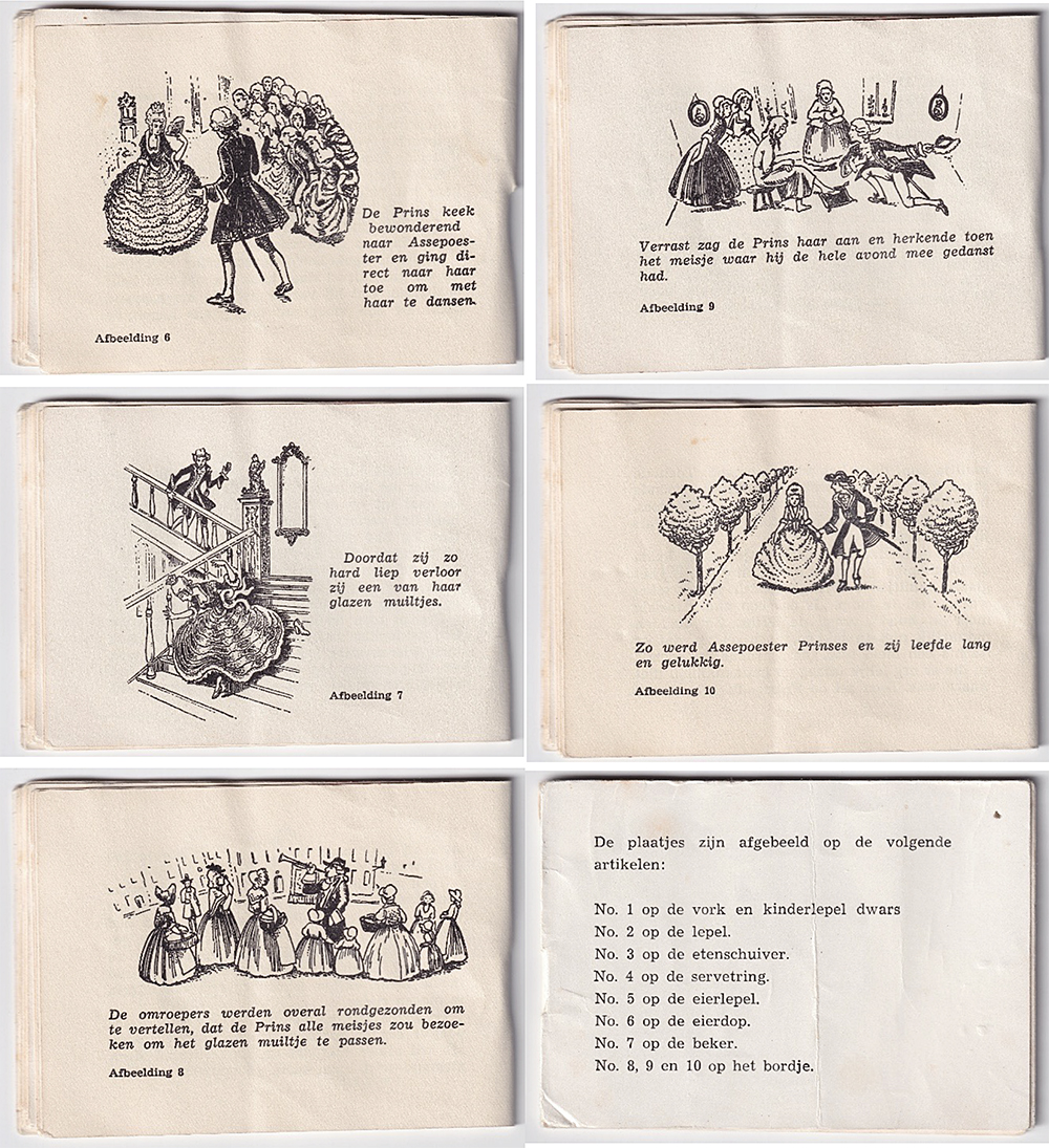 In elke etuidoos 929 zat een prentenboekje van het sprookje dat afgebeeld staat op het bestek en servies. De boekjes hebben een afmeting van 95 x 65 mm. In het boekje staat op welk onderdeel de tien tekeningen staan.
