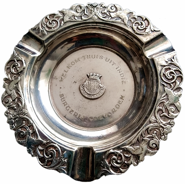 Op 17 augustus 1945 werd de Republiek Indonesië uitgeroepen. Voor het herstel van het Nederlandse gezag werden ruim 120.000 Nederlandse militairen naar Indonesië overgebracht. De repatriëring nam in 1948 een aanvang. Om de opvang van de gedemobiliseerde militairen te regelen werden plaatselijke demobilisatiecomités opgericht. Het comité in Coevorden reikte in 1950 aan de gedemobiliseerden als welkomstgeschenk een zilveren asbakje uit met de inscriptie: WELKOM THUIS UIT INDIË. | DE BURGERIJ VAN COEVORDEN.